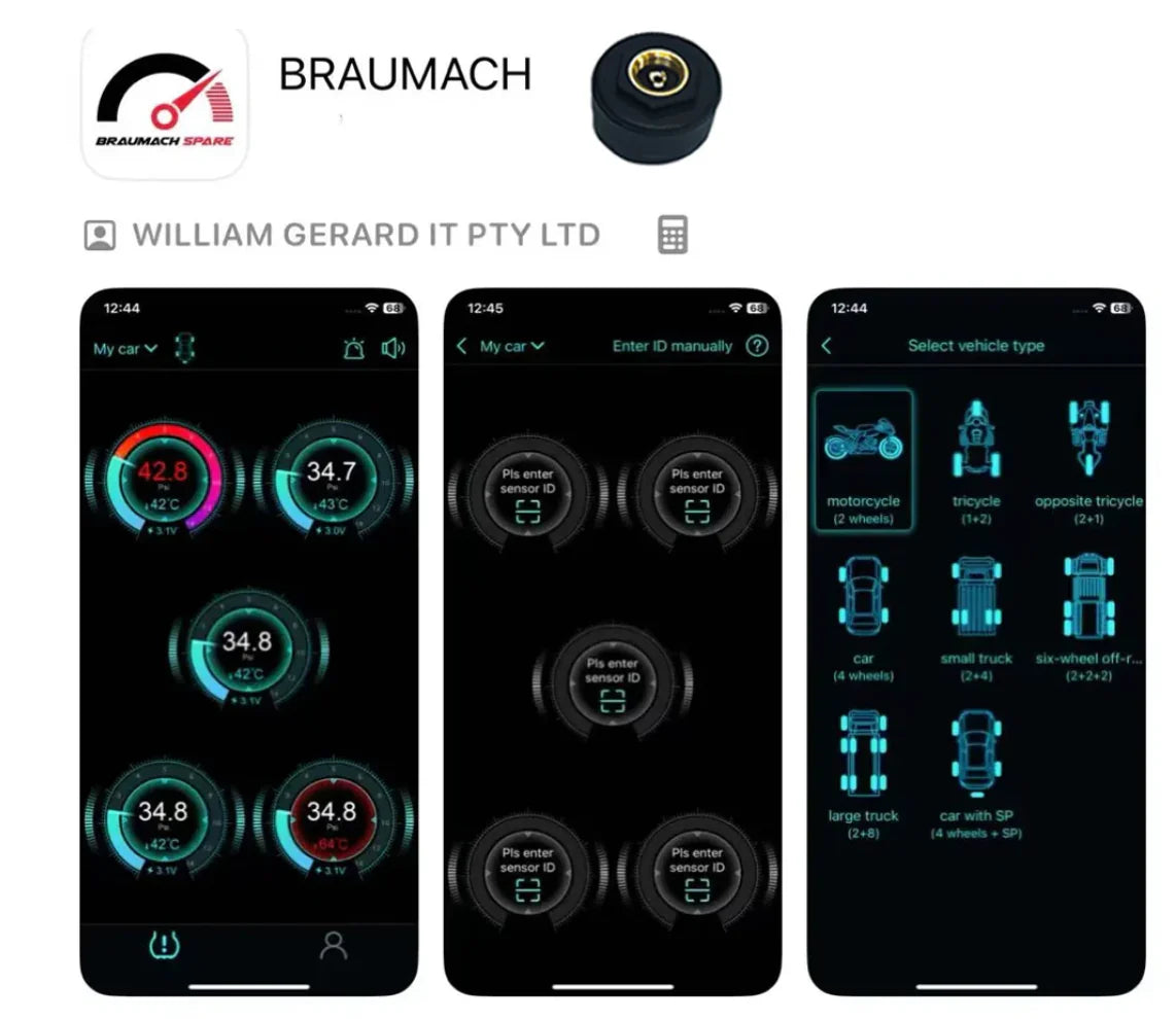 The BRAUMACH SPARE Tyre Valve Pressure Sensor phone app makes checking your car’s tyre pressure simple and convenient, available for both iOS and Android. No more digging through the boot to check your spare wheel tyre’s pressure—just use the app to monitor it instantly. Get alerts if your spare tyre needs air, keeping you prepared for emergencies. Plus, you can add four more sensors to track all your car’s tyres in one place. With this easy-to-use app, you’ll stay on top of tyre maintenance, ensuring safety and peace of mind without the hassle of manual checks.