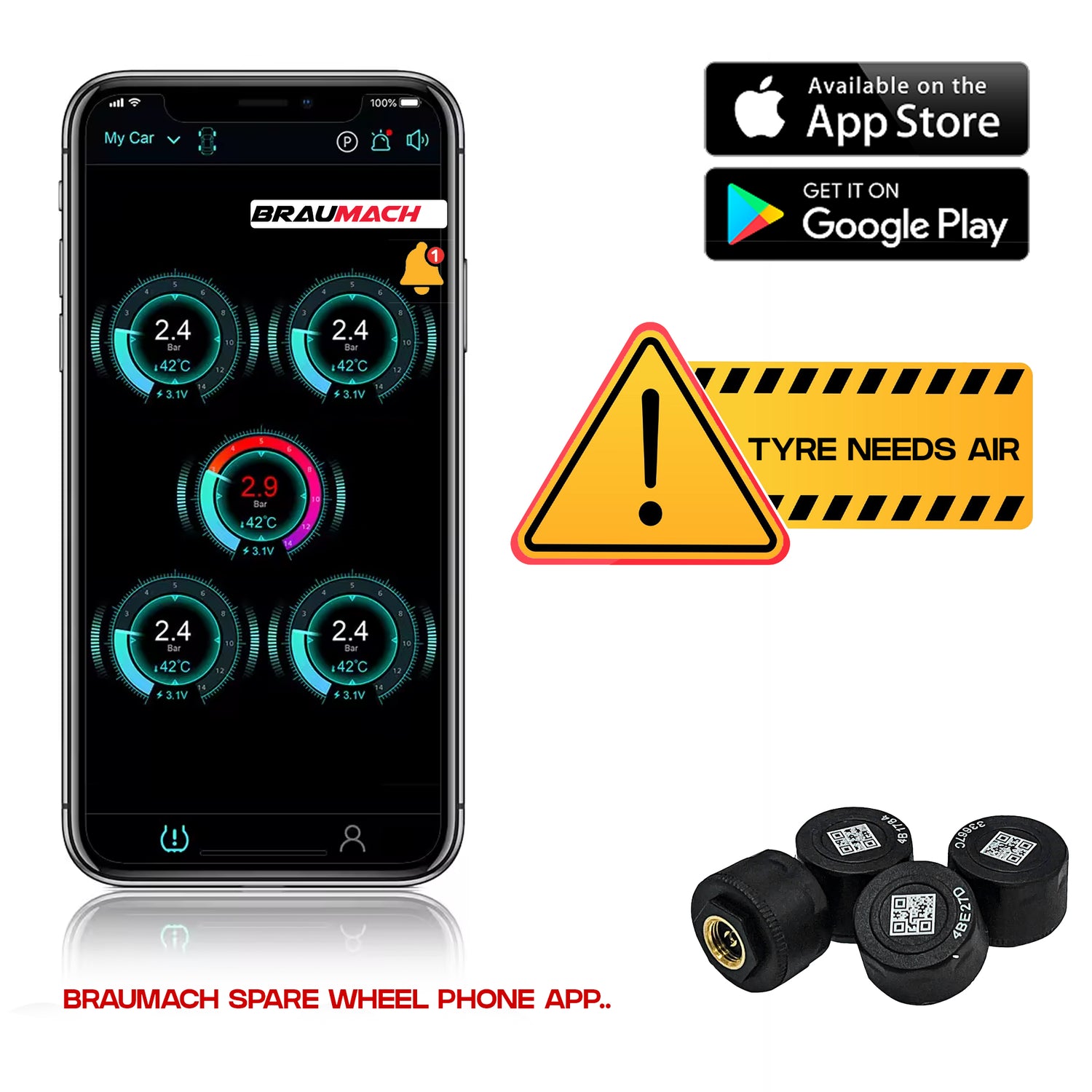 The BRAUMACH SPARE Tyre Valve Pressure Sensor phone app makes checking your car’s tyre pressure simple and convenient, available for both iOS and Android. No more digging through the boot to check your spare wheel tyre’s pressure—just use the app to monitor it instantly. Get alerts if your spare tyre needs air, keeping you prepared for emergencies. Plus, you can add four more sensors to track all your car’s tyres in one place. With this easy-to-use app, you’ll stay on top of tyre maintenance, ensuring safety and peace of mind without the hassle of manual checks.